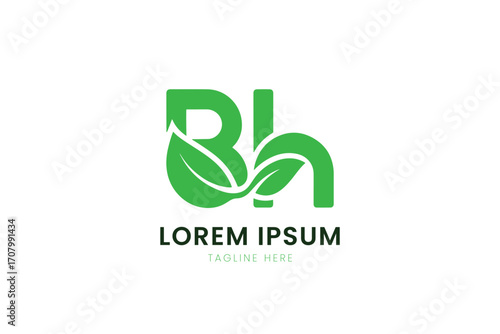 Minimalist green bh letter logo with leaf detail for eco-friendly brands and businesses