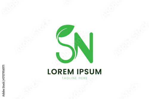 Minimalist green sn letter logo with leaf accent and lorem ipsum text