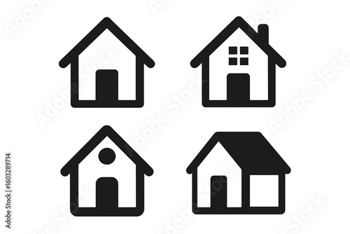 Minimalist Home Icon Set. Modern House Symbol Collection for App, UI, Web Design. Black and White Vector Illustration. Simple Geometric Real Estate Pictograms. Isolated Transparent Background.