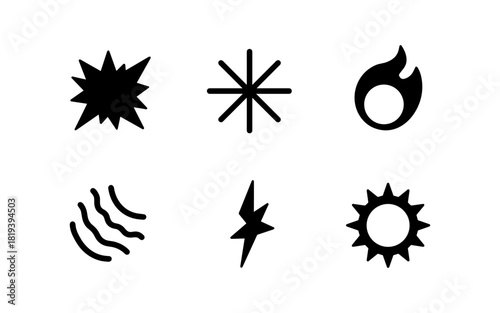Minimalist icon set featuring starburst, flame, wave, bolt, and sun designs