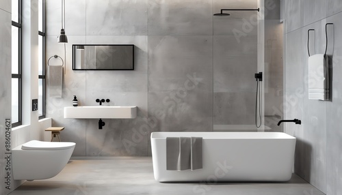 Minimalist industrial bathroom with concrete walls, sleek fixtures, and minimalist decor, bathroom interior, industrial minimalism