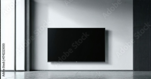 Minimalist interior features wallmounted television. Neutral tones dominate space, creating calm atmosphere. Clean lines define room design.