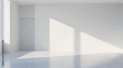 Minimalist interior space, bright white walls with soft shadows, open and airy atmosphere, ideal for showcasing creativity.