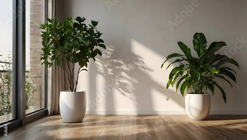 Minimalist Interior with Potted Green Plants and Natural Sunlight – Modern Home Aesthetic back ground