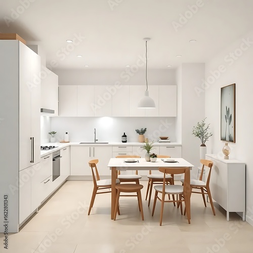 minimalist kitchen with dining area — all with a white background, elegant, simple, and multifunctional focus