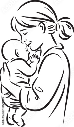 Minimalist line drawing of a mother holding a baby, soft emotional continuous sketch style, elegant black and white outline illustration