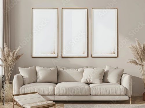 Minimalist living room interior with three empty frames above a white sofa. pampas grass. and a wooden ottoman
