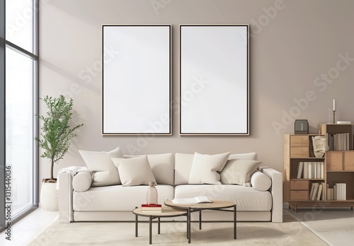 Minimalist living room with a white sofa. two empty frames. a coffee table. and a bookshelf
