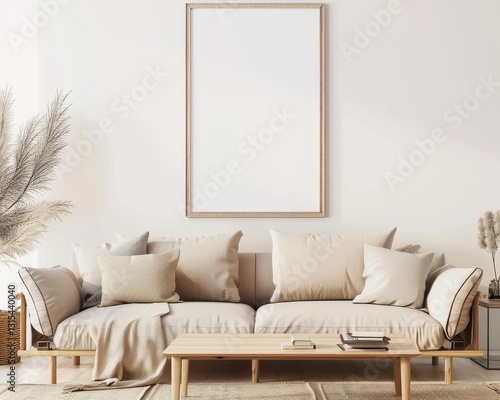 Minimalist living room with beige sofa. wooden coffee table. and a blank frame on the wall