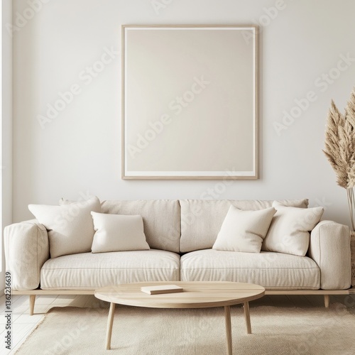 Minimalist living room with beige sofa, wooden coffee table, and blank frame.