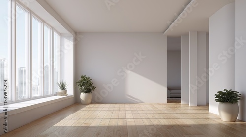 Minimalist living room with white walls and wooden floor, bathed in soft natural light. Serene simplicity in a spacious modern interior.