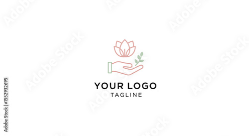 Minimalist logo design featuring a hand holding a lotus flower with a small leaf symbolizing care and growth