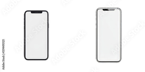 Minimalist mockups of two isolated smartphone designs showcasing blank screens for digital presentations