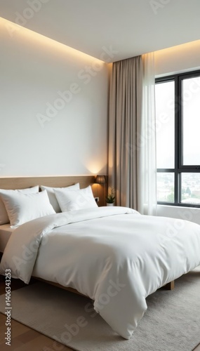 Minimalist Scandinavian bedroom with king-size bed and white linens, bed linen, white sheets