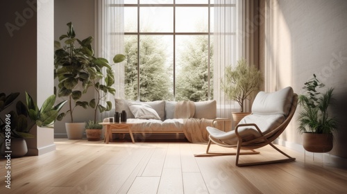 Minimalist Scandinavian Living Room Interior with Cozy Armchair and Plant Accents