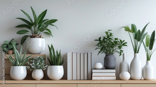 Minimalist Shelf with Plants, Books, and White Ceramics on Gray Background (AI-generated)