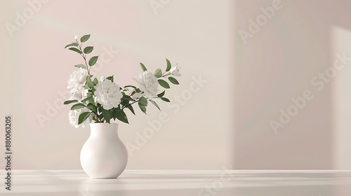 Minimalist Still Life with White Flowers in a Ceramic Vase on a White Table