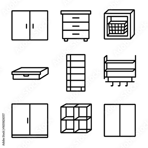 Minimalist Storage Icons. Line style icons of clean storage solutions: flat wall cabinet, hidden drawer unit, basket in cube shelf