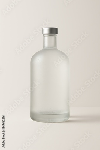 Minimalist studio shot of a premium unlabeled gin bottle, frosted glass texture, subtle condensation, soft shadow on neutral background, luxury product mockup, clean commercial aesthetic.