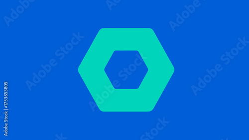 Minimalist teal hexagon with negative space center on a vibrant blue background, abstract geometric design element.