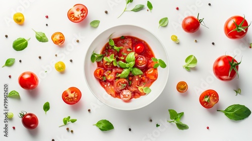 Minimalist top view of fresh gazpacho in a sleek bowl, ingredients artistically scattered around, highlighting freshness on a stark white background