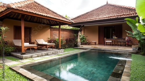 Minimalist tropical villa with pool and garden, embodying serene simplicity and harmony.