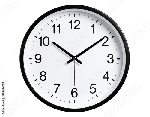 Minimalist Wall Clock with White Face and Black Hands, Front View, Soft Shadow, Transparent Background