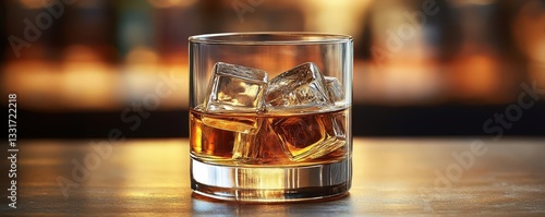 Minimalist whiskey glass with ice cubes, dramatic lighting, rich amber tones, sophisticated vibe
