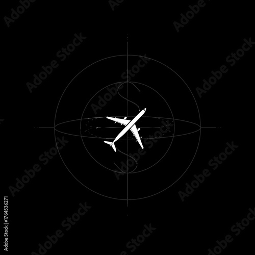 Minimalist white airplane silhouette over a subtle compass graphic on a dark black background, representing global travel and navigation.