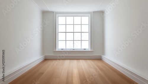 Minimalist white empty room with large window and wooden floor