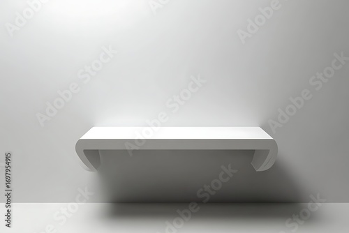 Minimalist white floating shelf against a gray wall, casting a soft shadow