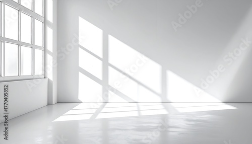 Minimalist white interior with sunlight casting window shadows on the wall and floor.