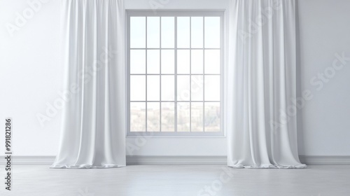 Minimalist White Room with Window and Curtains, 3D Rendering, Interior Design, White Room, Window Treatment, Minimalist Design