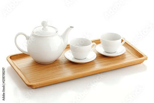 Minimalist White Tea Service: Teapot and Cups on Bamboo Tray