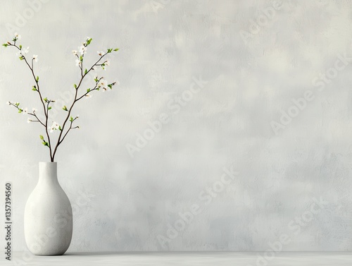 Minimalist White Vase with Flowering Branch Against Neutral Textured Wall, Spring Decor Concept