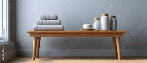 Minimalist wooden bench with neatly folded gray towels and ceramic jars with wooden lids in a modern bathroom setting