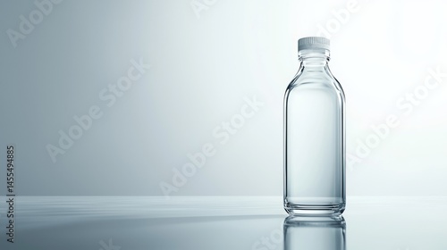 Minimalistic glass bottle containing clear liquid on reflective surface.