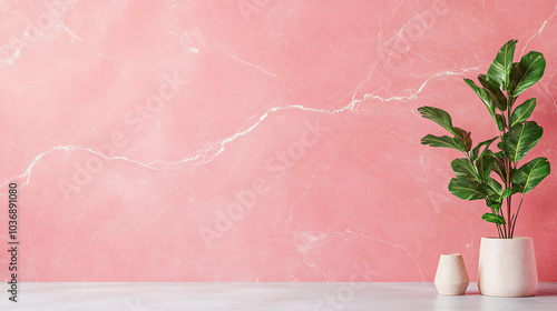Minimalistic interior with a pink marble wall and stylish vases holding a lush green plant, creating a fresh and modern atmosphere.