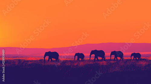 Minimalistic silhouettes of a group of elephants strolling through the savannah at dusk, saturated orange and purple sky