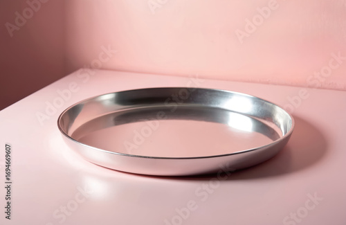 Minimalistic still life of circular metal tray with shiny reflective surface on soft pink background. Contemporary design accent for kitchen table setting. Sleek, smooth, polished object in modern
