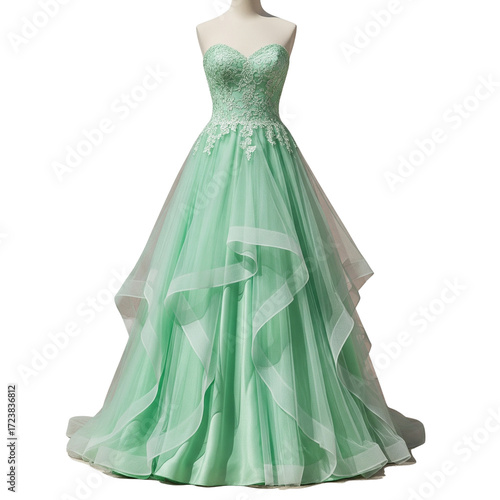 Mint Green Sweetheart Ball Gown with Strapless Lace Bodice and Ruffled Tulle Skirt