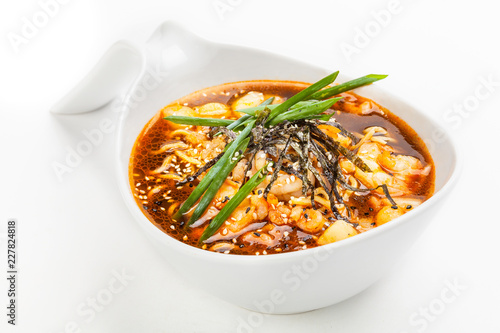 Miso soup in white bowl.