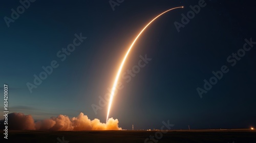 missile trail through sky during defense system test, long exposure shot showing the arc trajectory