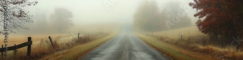Misty American Road: A Hazy Journey through Autumn's Foggy Countryside