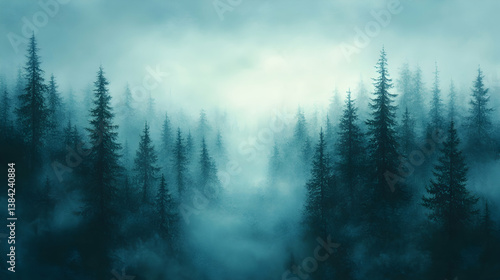 Misty dark forest with tall pine trees fades into a bright hazy sky The woods are obscured by a thick fog creating a
