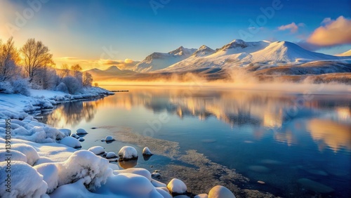 Misty dawn breaks over the serene lake of Abisko National Park as the sun rises behind mountains covered in snow and lichen, Snow, Frozen Water