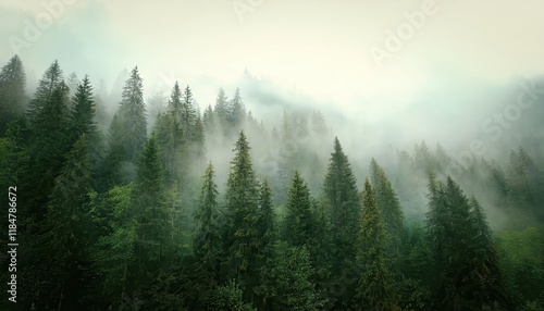 misty evergreen forest with dense tree canopy and soft atmospheric fog, evoking tranquility and connection to nature's serenity