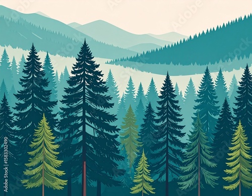 Misty fir forest landscape in hipster vintage retro style with soft faded tones. Ideal for travel posters, nature backgrounds, adventure branding, or retro-themed visuals