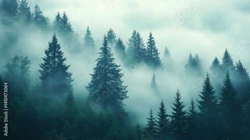 Misty Forest Landscape with Towering Fir Trees and Soft Fog Evoking Tranquility and Nostalgia (1)