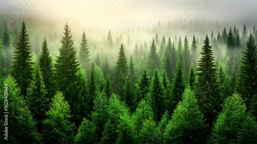 Misty forest of tall evergreen trees.